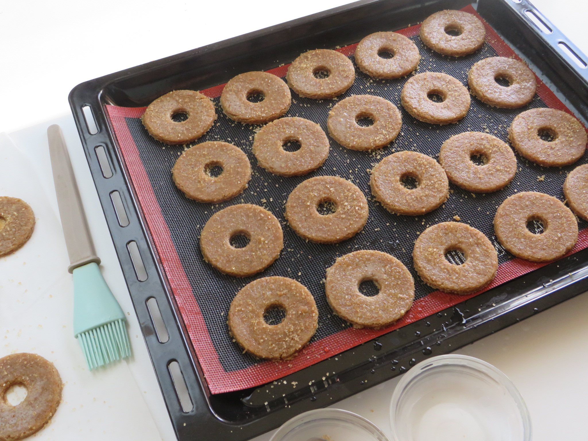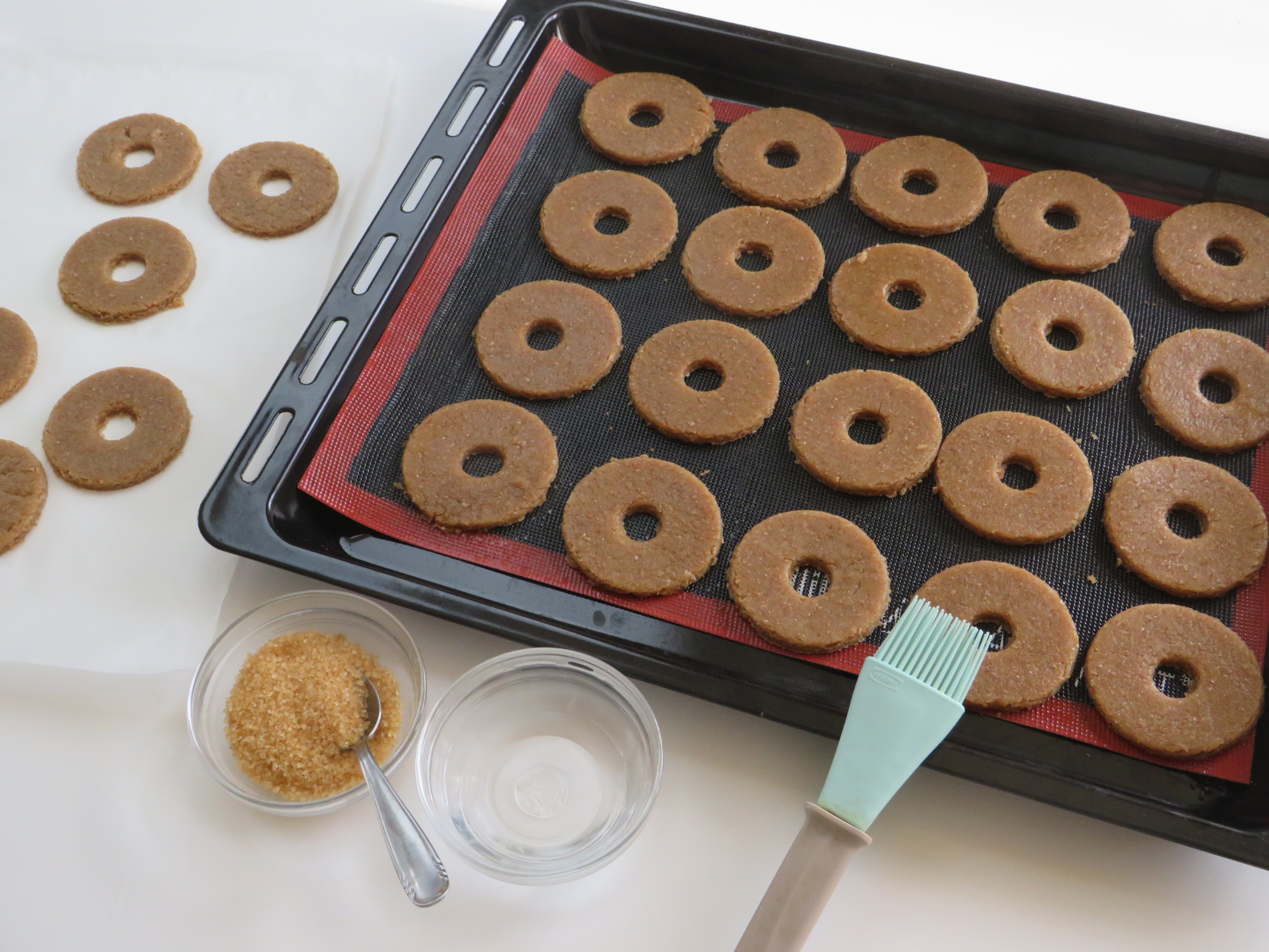 In fine spennellare con acqua e spolverate con zucchero di canna. I biscotti integrali cuociono velocemente, devono risultare leggermente dorati in superficie. Sfornate e lasciate raffreddare completamente prima di gustare!